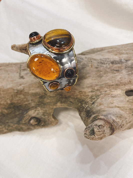 Brass Trim Cuff Semi Precious Stones In Multi Amber (Acrylic)/Tiger Eye/Black Onyx