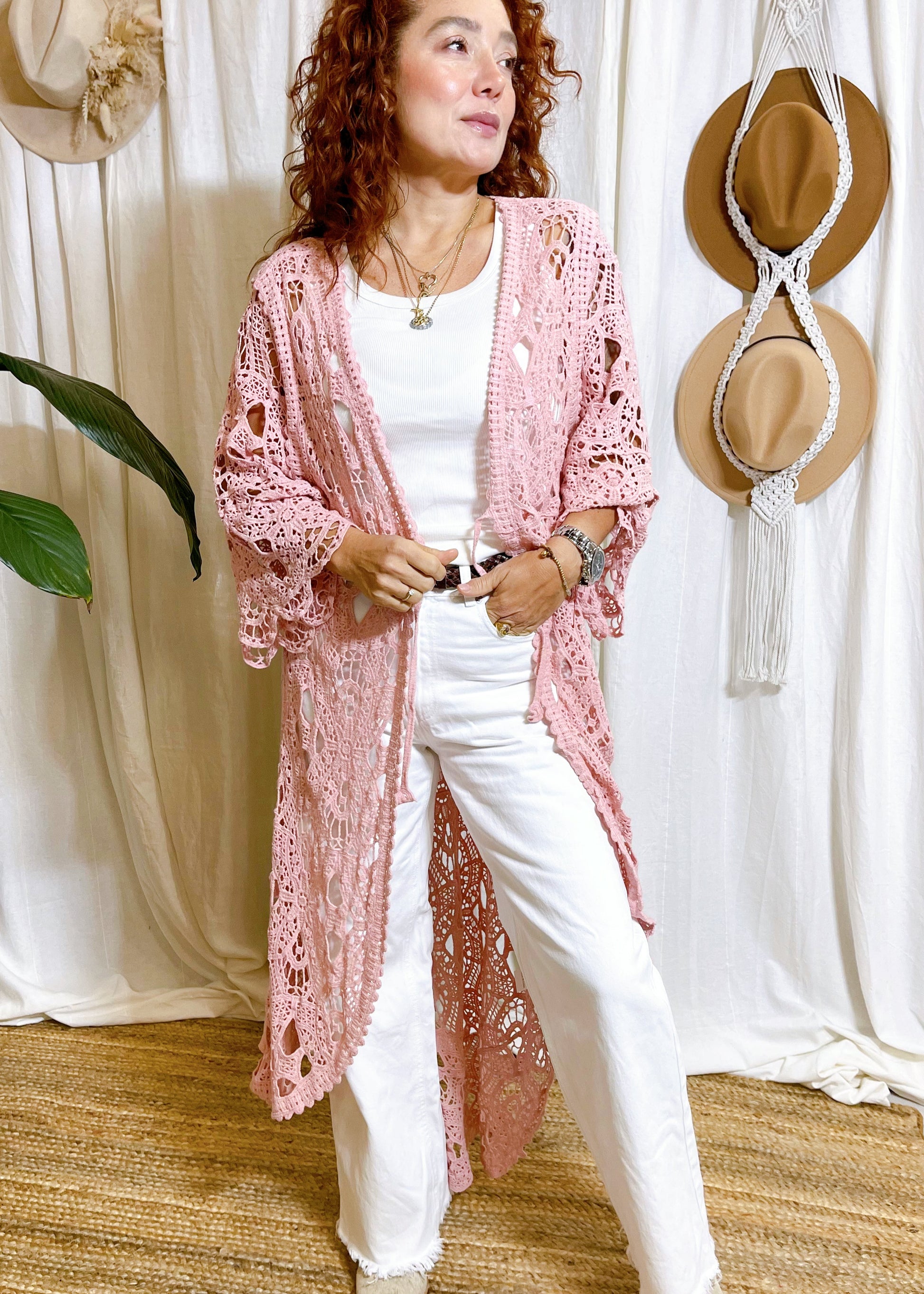 A dreamy Pink crochet lace kimono that adds effortless boho charm to any look. Lightweight, full-length, and perfect for layering.