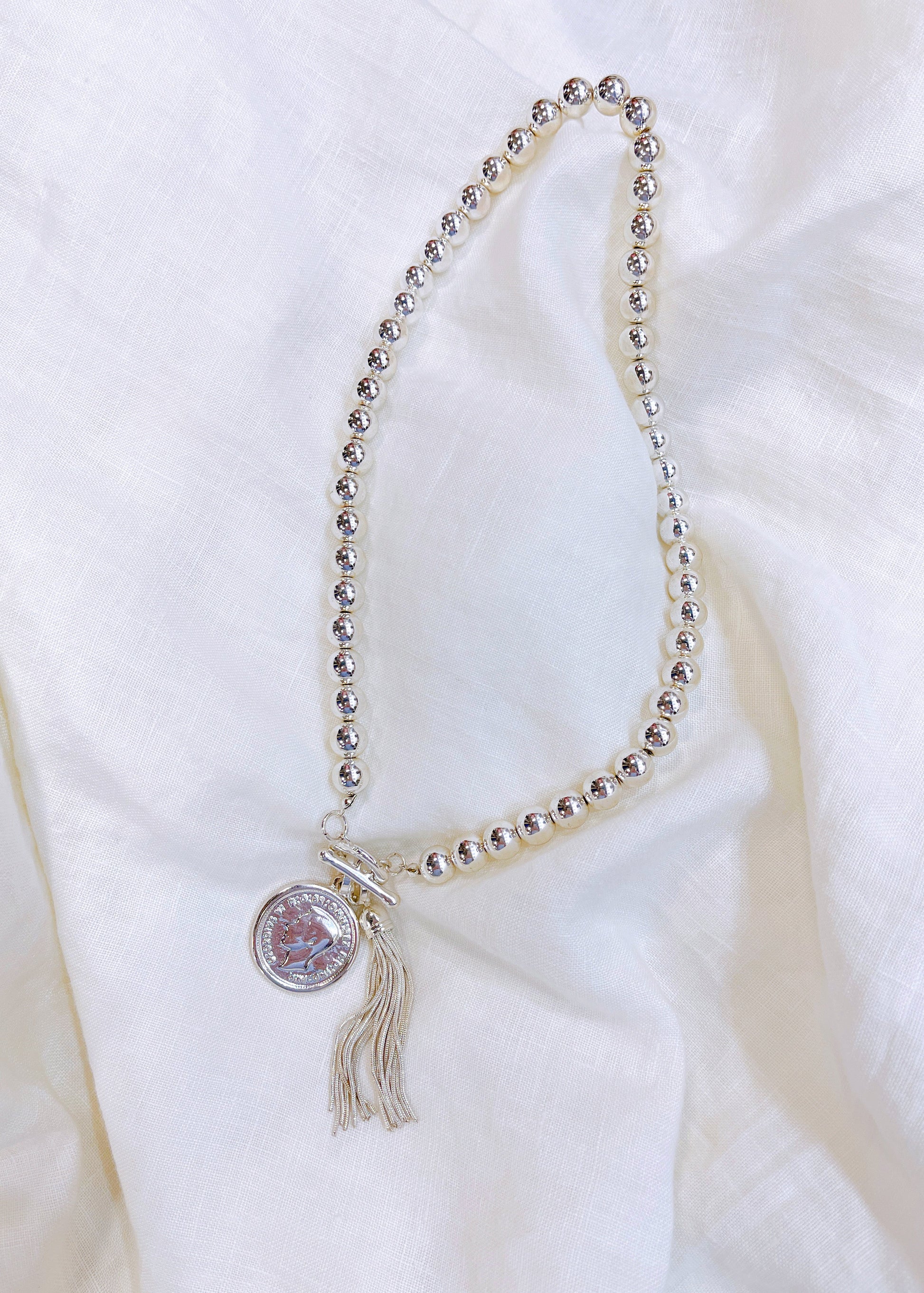 Turn heads with this ball chain necklace featuring silver tone beads, a vintage style coin pendant + a chic tassel accent. The toggle clasp adds a modern touch, making it easy to wear while adding detail to your look. Perfect as a statement piece or layered with other necklaces for effortless boho luxe style.