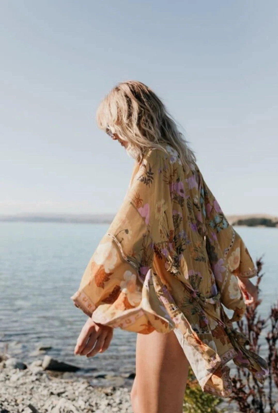 Spell & The Gypsy Collective Wild Bloom Short Kimono in Mustard is a standout piece from the brand's collection, celebrated for its vibrant floral print and relaxed silhouette. Crafted from 100% rayon, this kimono offers both comfort and style, making it a versatile addition to any wardrobe.
