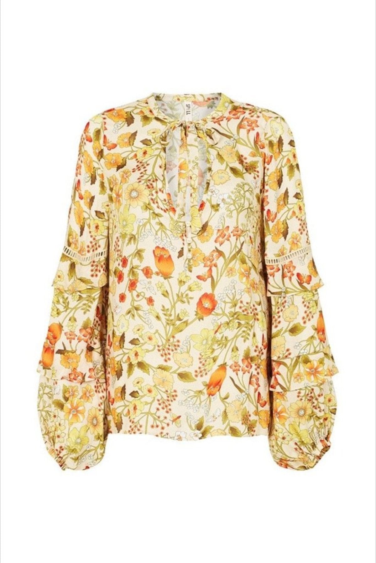 Spell & The Gypsy Collective Sayulita Blouse showcases a V-neckline with a partial button placket, adorned with a tie closure at the neckline. It features ruffled sleeves with ladder lace trim and elasticized cuffs, adding a touch of femininity and ease of wear.