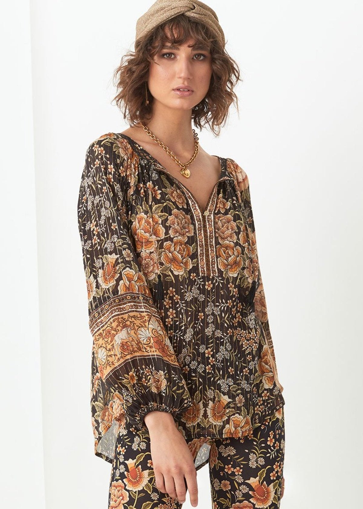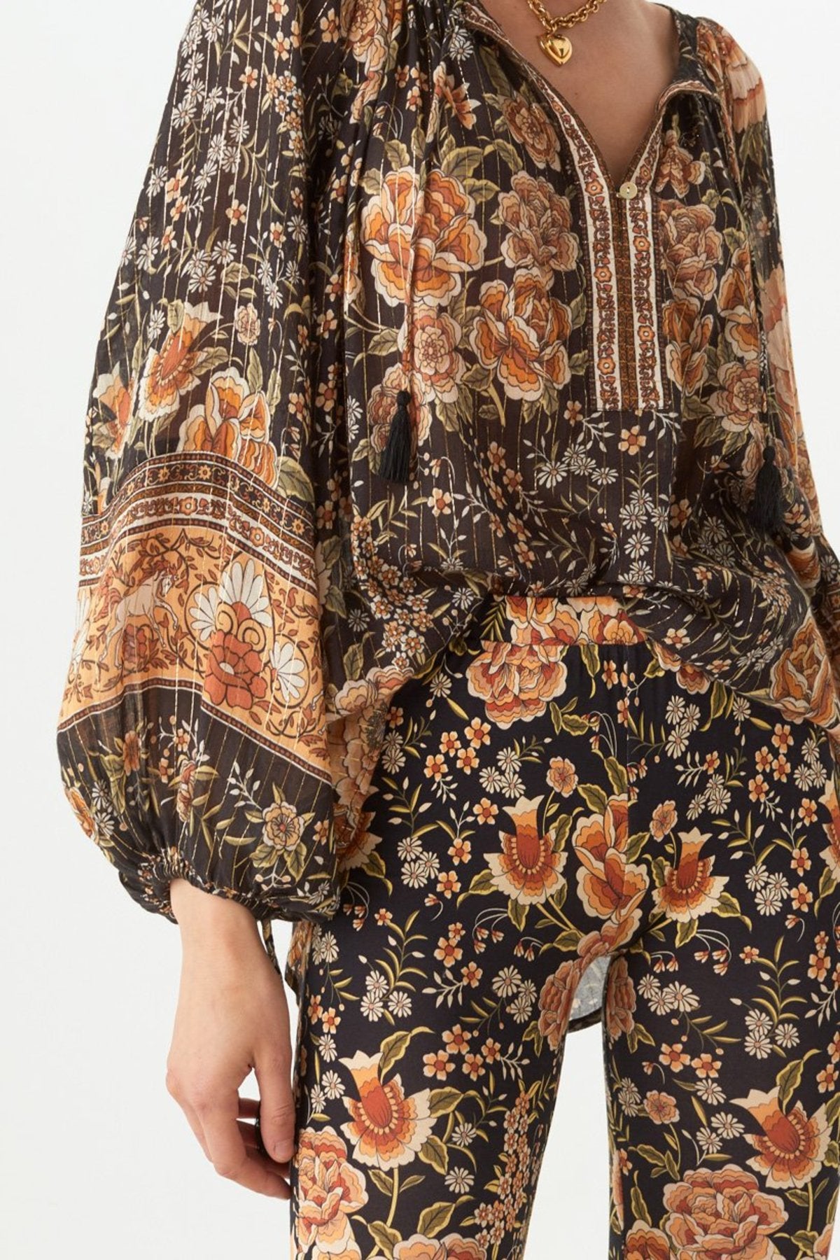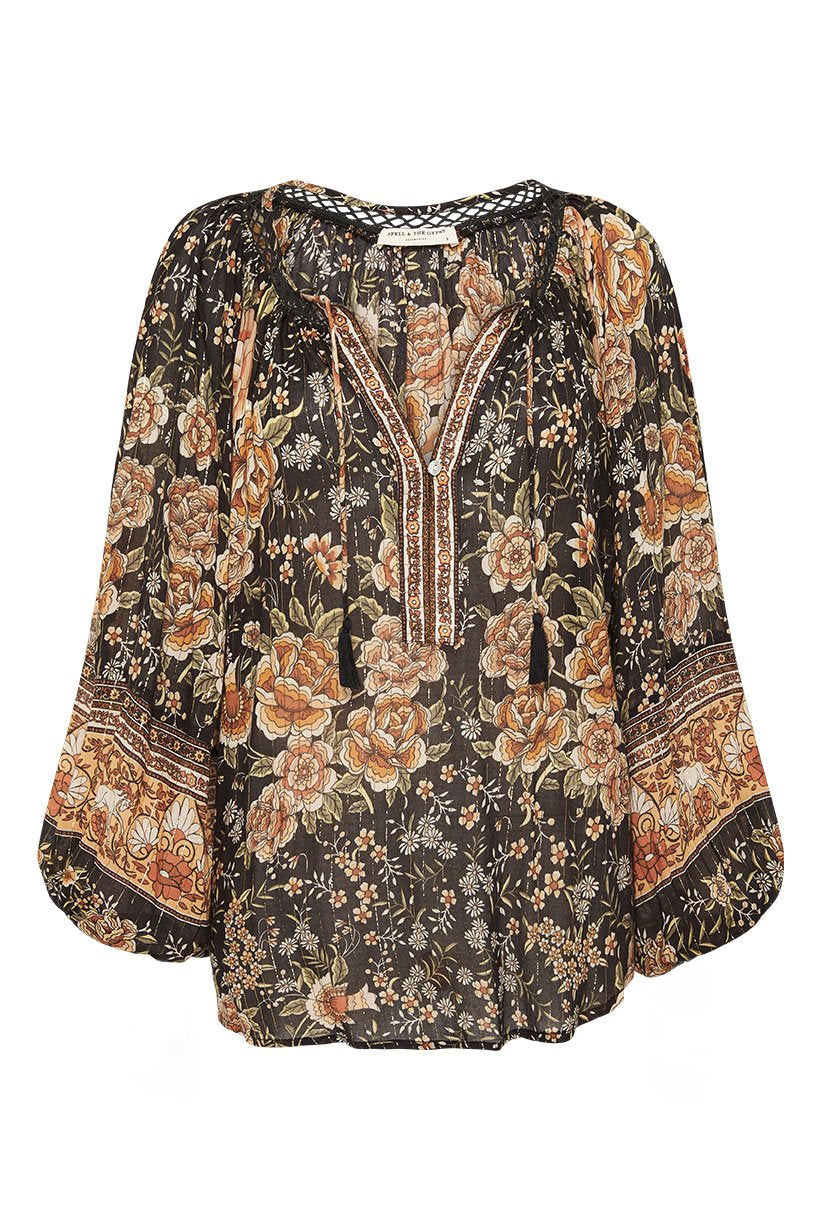 Spell & The Gypsy Collective Mystic Blouse in Nightfall Embrace bohemian elegance in the Mystic Blouse by Spell & The Gypsy Collective. Featuring a moody floral print with a touch of gold lurex shimmer, this relaxed-fit blouse is crafted from a soft blend of organic cotton and eco-friendly viscose. With its billowy sleeves, tassel ties, and romantic vibe, it’s perfect for dressing up or down.
