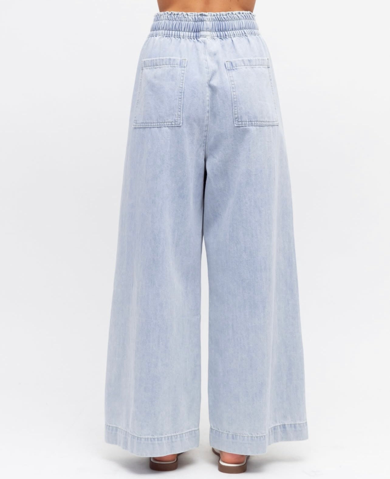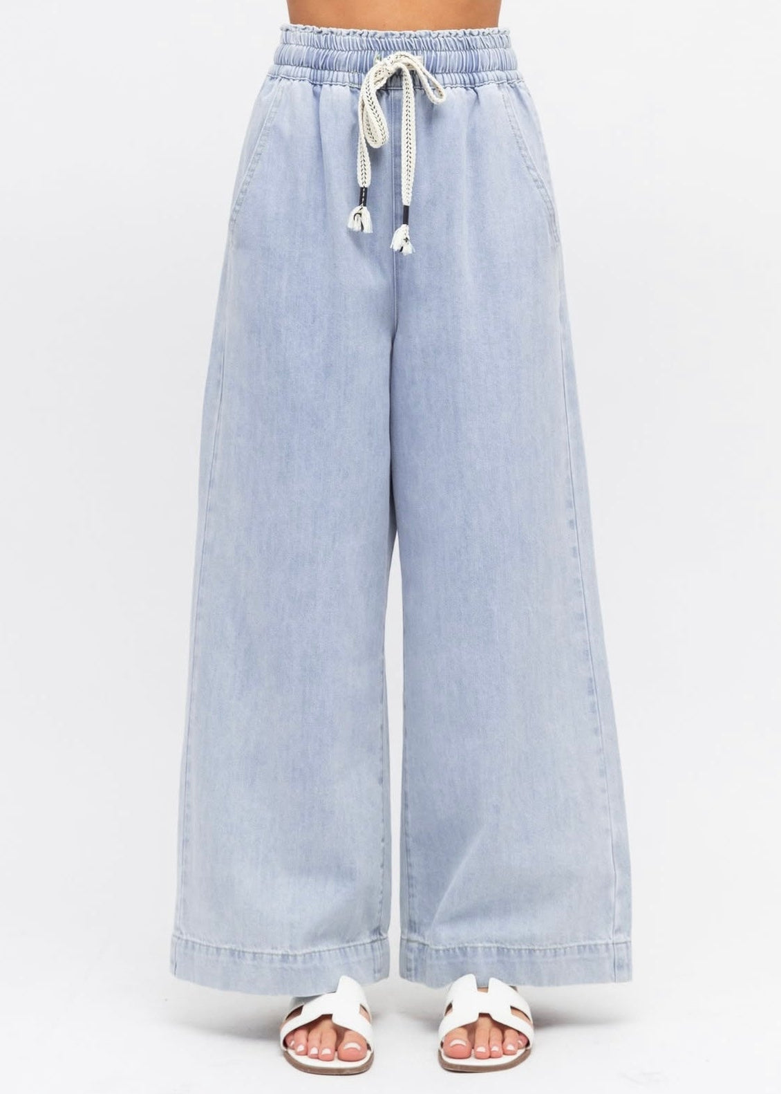 "Effortlessly cool and endlessly comfortable these 100% cotton, light denim wide leg jeans are your new go to for laid back chic. Featuring an elastic waistband with rope drawstring, roomy pockets, and a relaxed wide leg fit, they’re perfect for casual days or styling up with your favourite top.